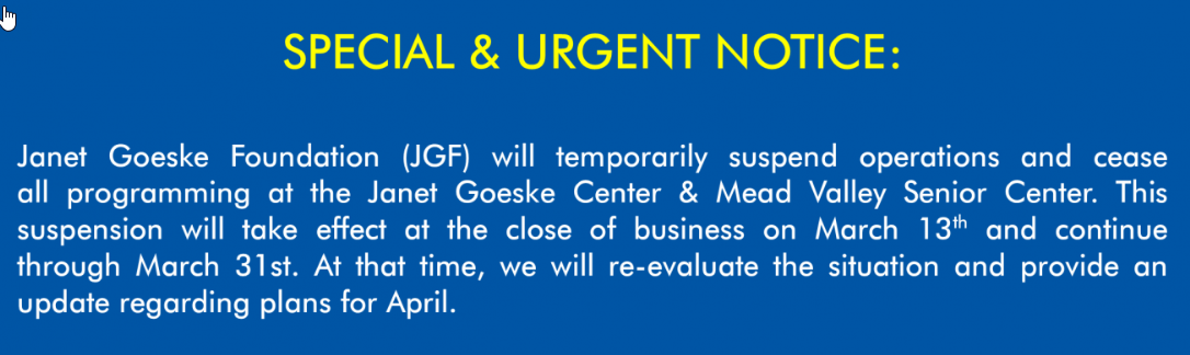 SPECIAL NOTICE:Due to rising concerns about public health and safety, Janet Goeske Foundation (JGF) will temporarily suspend operations and cease all programming at Janet Goeske Center & Mead Valley Senior Center. This suspension will take effect at the close of business on March 13th and continue through March 31st.As you may know, serious efforts are underway to slow the rate of spread of the novel coronavirus (COVID-19). The Centers for Disease Control (CDC) & California Department of Public Health (CDHP) recently recommended that all gatherings of individuals, at high-risk for severe illness, should be limited to no more than 10 people. JGF serves a high-volume of at-risk individuals and is not able to enforce the social-distancing guidelines required to maintain safe operations.Near the end of March JGF will re-evaluate the situation and provide an update regarding plans for April 2020.We appreciate your support, understanding, and cooperation during this time. We apologize for the inconvenience but please know we have your best interests at heart. Your health and wellness is our #1 Priority. |